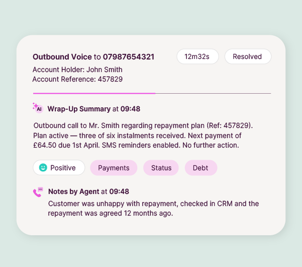 Agent Wrap-Up Summary generates structured, CRM-ready notes at the point of wrap - using the transcript and interaction context your agents just handled. They review, edit, and save. No manual note-taking. No context lost. No separate tool.